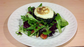 Whisk olive oil, vinegar, salt and pepper for dressing and pour over greens and tomato. Place a stuffed mushroom over salad and enjoy!